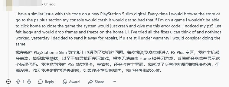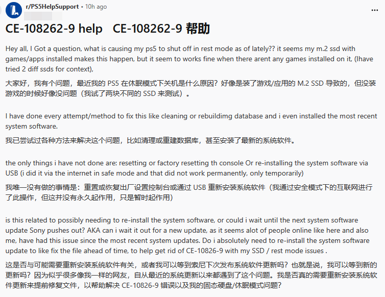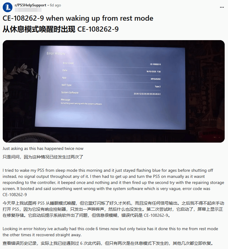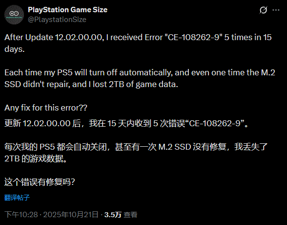 该博主表示,在为自己的PS5主机安装12.02.00.00版本更新后,短短15天内就遭遇了5次“CE-108262-9”错误提示。每次报错都会导致PS5自动关机,更严重的是,其中一次故障中M.2 SSD未能成功修复,直接造成了其存储的2TB游戏数据全部丢失。