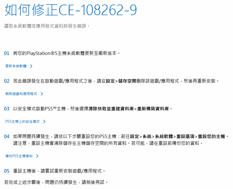 根据索尼官方网站的说明,“CE-108262-9”错误代码代表读取系统软件或应用程序资料时发生异常。索尼方面提供的官方解决方法可参考下图。