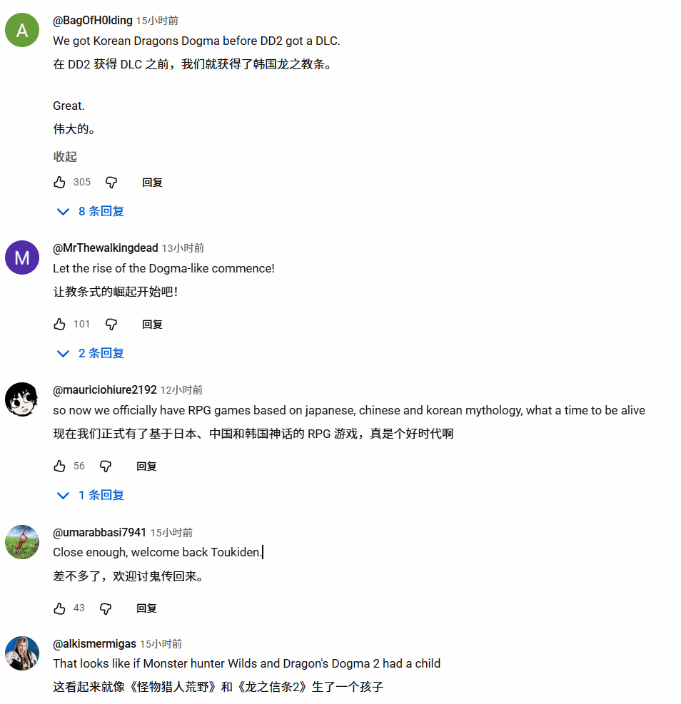 还有网友做出了更形象的评价:"这看起来就像是《怪物猎人:荒野》和《龙之信条2》的结合体。"此外,也有玩家提及国产神话大作《黑神话:悟空》,称:"《黑神话》改变了部分开发者的创作视野,我很喜欢这种影响。"