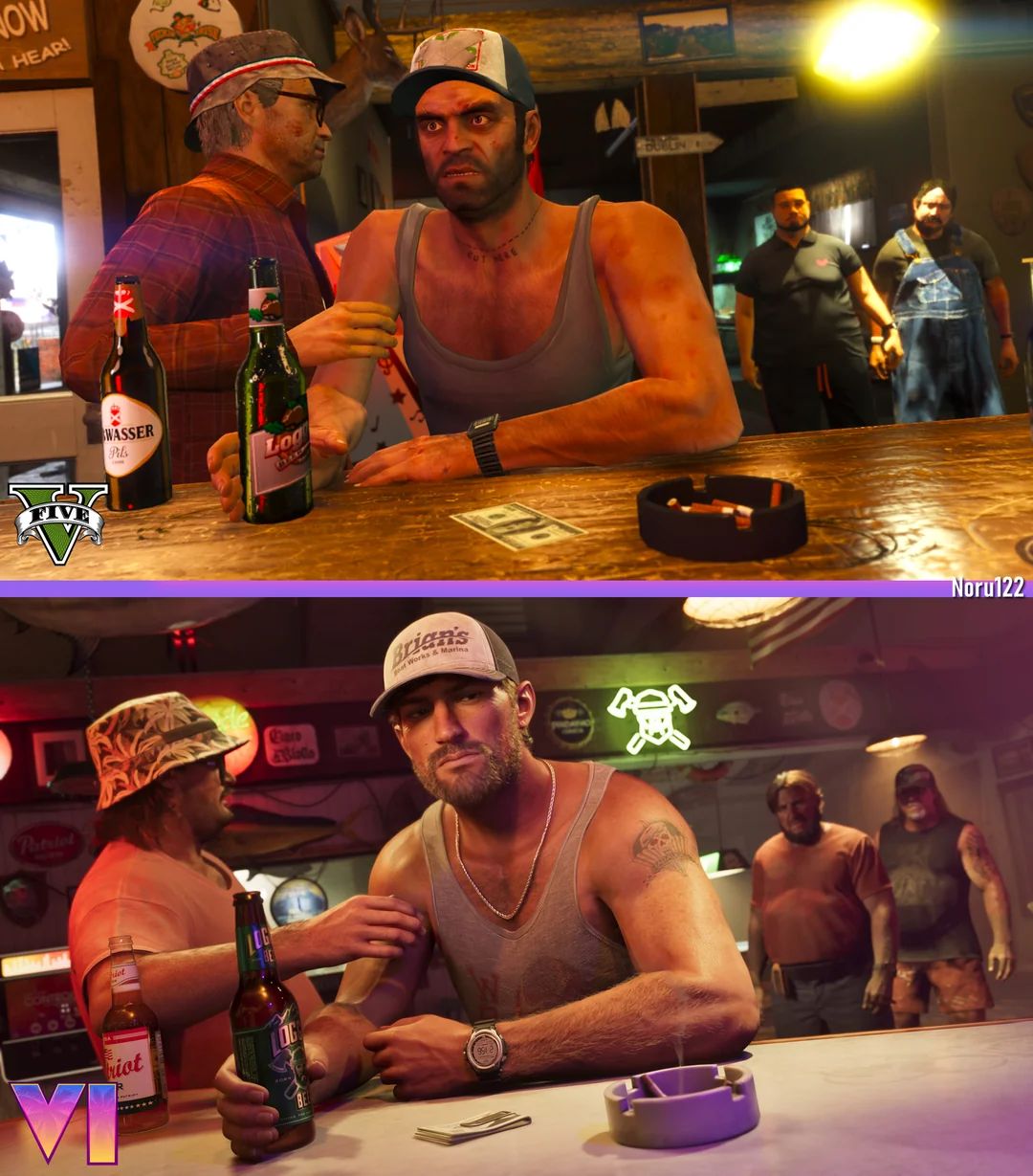 近日,外网Reddit社区玩家@Noru122分享了一组用《GTA5》(玩家俗称“三男一狗”)还原《GTA6》官方图片的创意作品,通过对比直观展现出R星在画面技术上的巨大进步,引发玩家热议。