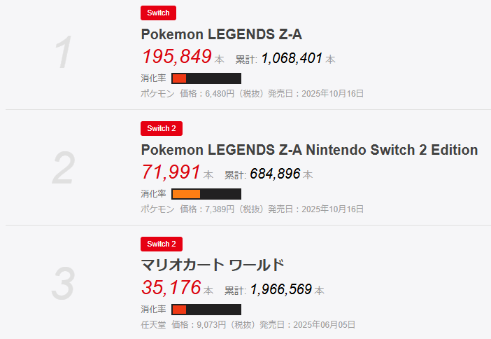 Fami通最新公布的日本游戏周销量榜显示,《宝可梦传说:Z-A》展现出强劲的市场爆发力,销量增长势头迅猛。其中原版与NS2版累计销量分别达到1,068,401份和684,896份,仅上周单周新增销量便分别斩获195,849份与71,991份。