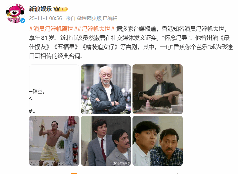 香港影坛传来悲痛消息——知名演员冯淬帆不幸辞世,享年81岁。这一消息由新北市议员蔡淑君通过社交媒体发文证实,她在文中以"怀念冯导"的表述,寄托了对这位影人的哀思。