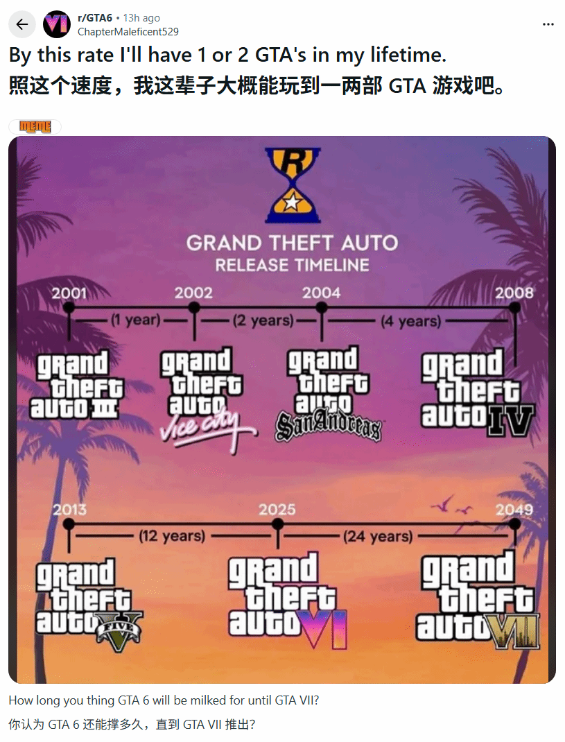 该玩家在帖中分享的数据显示,GTA系列的开发时长正以近乎"翻倍"的速度增长:从早期作品的1年、2年,到《GTA5》(玩家戏称"三男一狗")耗时4年,再到如今《GTA6》长达12年的开发周期。按照这一趋势,有玩家初步推算《GTA7》的推出时间可能要到2029年。