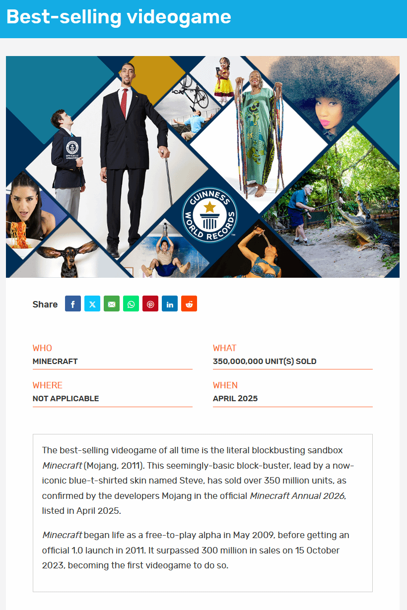 该销量纪录最初由吉尼斯世界纪录于2025年4月披露,直到近期才被Mojang Studios在《我的世界年度报告2026》中正式确认。相较于2023年10月首次达成的3亿份销量纪录,《我的世界》在这段时间内又增长了5000万份,这样的增长速度与成就至今尚无其他游戏能够企及。