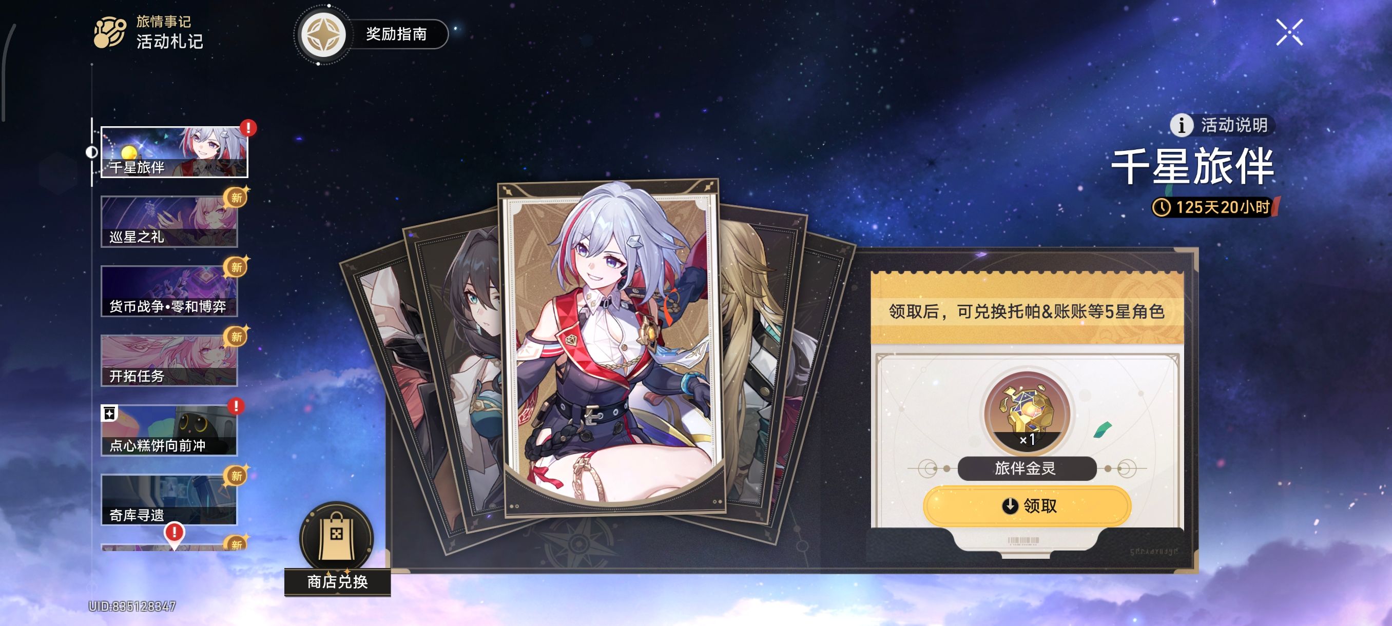 版本福利第一弹:3.7版本更新后至4.0版本结束期间,玩家登录游戏就能领取珍贵道具“旅伴金灵”,可直接从兑换名单中自选一名5星角色。兑换池阵容相当豪华,涵盖七个常驻5星角色,外加阮梅、罗刹、托帕三位人气限定5星,无论是补全阵容还是解锁心仪角色,都能满足需求。