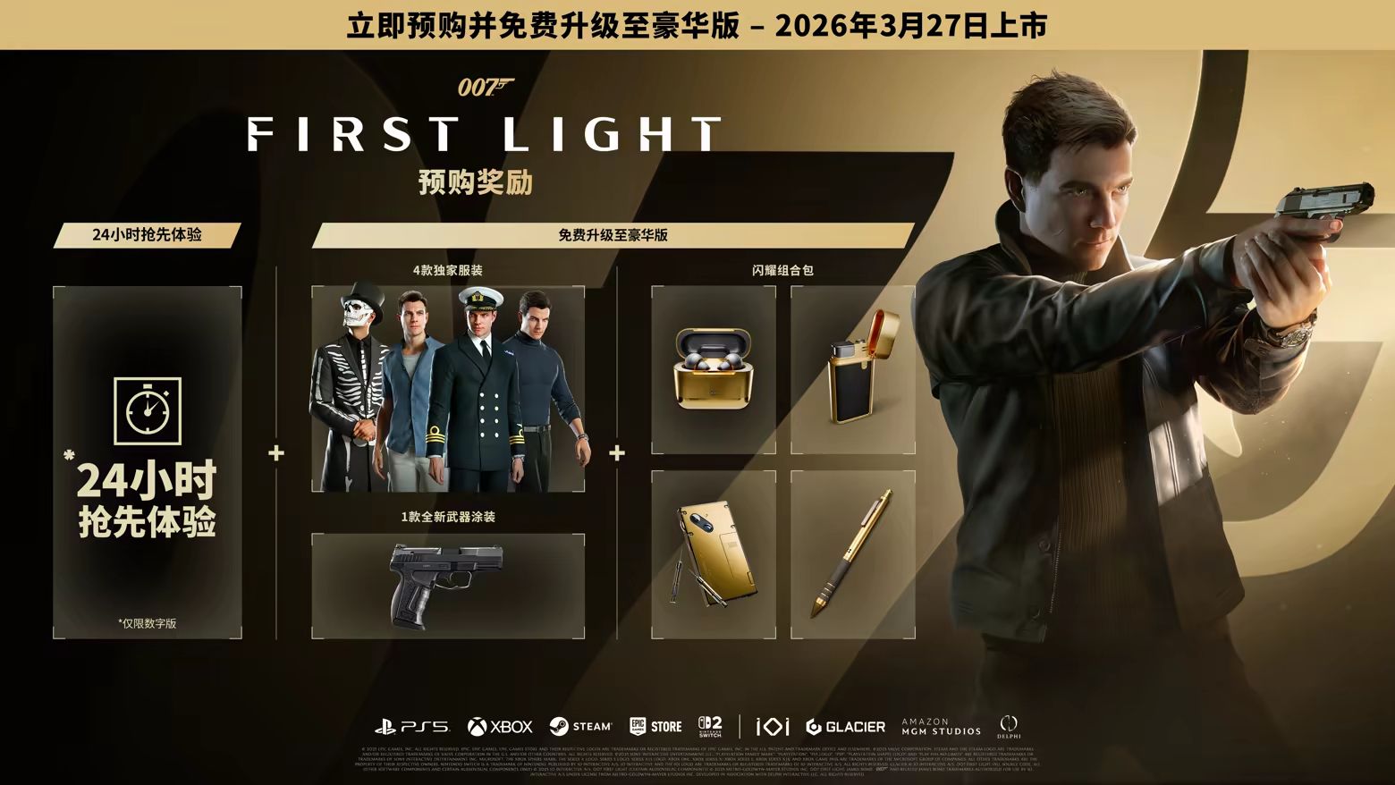 此次预购福利诚意满满,玩家提前锁定游戏即可免费升级至豪华版,还能解锁24小时抢先体验权,率先踏入邦德的起源冒险。豪华版包含丰富专属内容:亡灵之日、沙漠先驱、寂静之锚、绅士特工4款特色服装,特工之印武器皮肤,以及闪亮打火机、闪亮耳机、闪亮飞镖枪、闪亮钢笔4款道具皮肤。