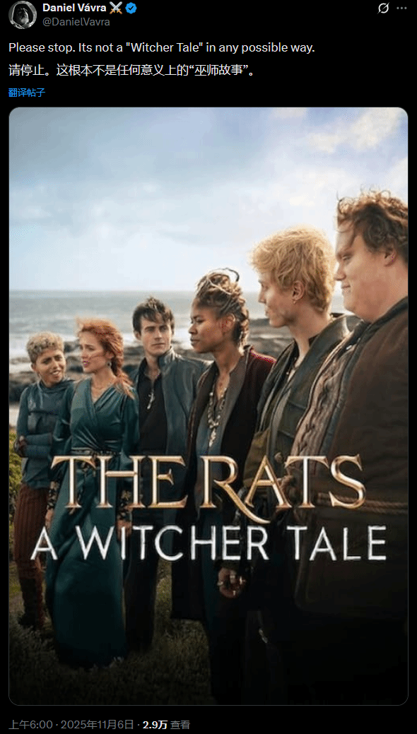 《天国:拯救2》的编剧兼游戏总监、Warhorse Studios联合创始人Daniel Vávra,在个人社交媒体上公开表达了对这部影片的不满。他直言“从任何角度看,这都不能算是一部《巫师》剧集”,甚至情绪激烈地呼吁“求你们别拍了”,毫不掩饰对影片的失望。