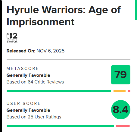 《塞尔达无双 封印战记》现已正式发售,游戏口碑也随之解禁。目前该作在M站的媒体均分为79分,其中IGN给出8分评价,GameSpot则打出7分。相较于媒体评分,玩家反馈更为热烈,M站玩家均分达到8.4分,整体评价呈现积极态势。