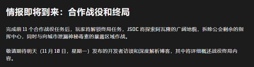 《使命召唤22:黑色行动7》即将迎来新动态,专注主机游戏爆料的推特用户@charlieINTEL带来消息:动视曾意外发布一篇博客后又删除,其中确认了合作战役模式的开发者访谈博客将于11月10日星期一推出,届时将深度解析战役终局内容。