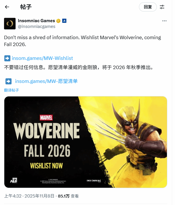 Insomniac Games官方推特近日发布推文称:“不要错过任何信息,将《漫威金刚狼》加入愿望单吧,本作将于2026年秋季推出。”尽管这则内容未对《GTA6》跳票事件有任何提及,但发布时机恰好处于该消息发酵期,意外收获了额外关注度。