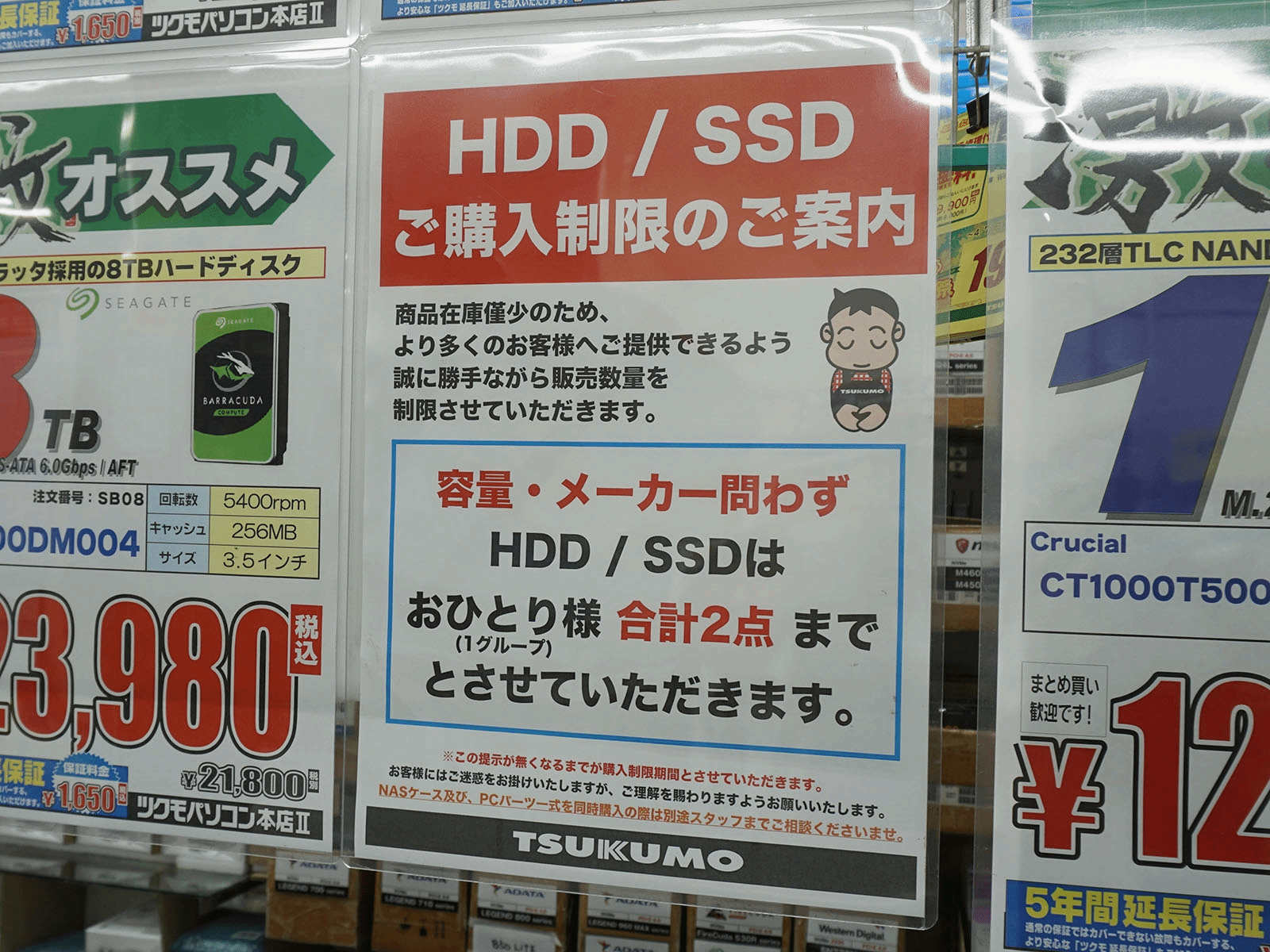 截至11月7日,PC Shop Ark、Tsukumo PC Main Store II和TSUKUMO eX.等多家知名DIY商店已确认限购措施。其中PC Shop Ark规定每组商品最多购买8件,而两家TSUKUMO商店限制更为严格,每组最多可买2个SSD/HDD和4张内存条(购买整机或NAS时可协商)。商家表示,限购源于“库存商品数量严重受限”,目前暂未确定解除限购的时间,且已有部分产品被经销商暂停供货,未来未限购店铺或也将跟进。
