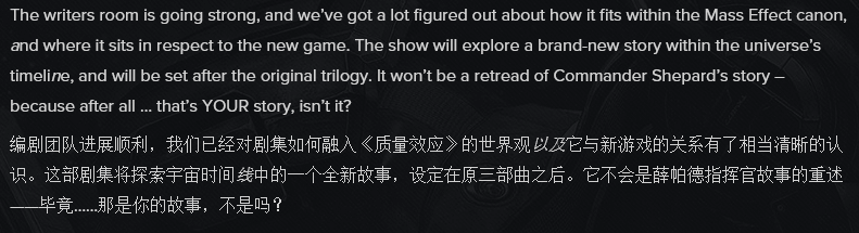 Mike Gamble在博客中表示:“编剧团队目前进展顺利,我们已经搞清楚了这部剧如何融入《质量效应》的正史,以及它在新游戏时间线中的位置。”他强调,“这部剧将探索宇宙时间线中的一个全新故事,设定在原始三部曲之后。它不会重述指挥官薛帕德的故事——毕竟,那是你自己的故事,不是吗?”这番表述既尊重了原作玩家的情感,也点明了剧集的原创核心定位。