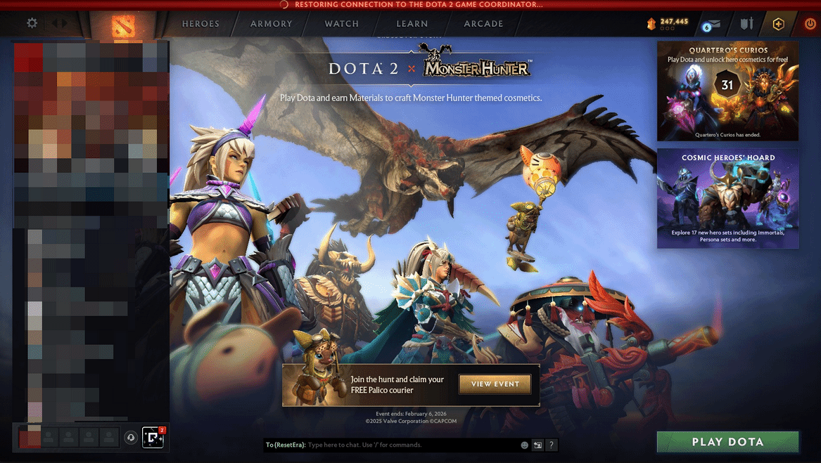今日,《Dota2》官方正式揭晓与《怪物猎人》的大型跨界联动计划,这场跨越MOBA与狩猎游戏两大品类的合作,以“英雄狩猎”为核心,带来套装打造、专属宠物、限定活动等多重内容,为玩家构建了一场兼具策略竞技与收集乐趣的跨次元盛宴。本次联动活动将持续至2026年2月6日,为期三个月的狩猎冒险现已全面开启。