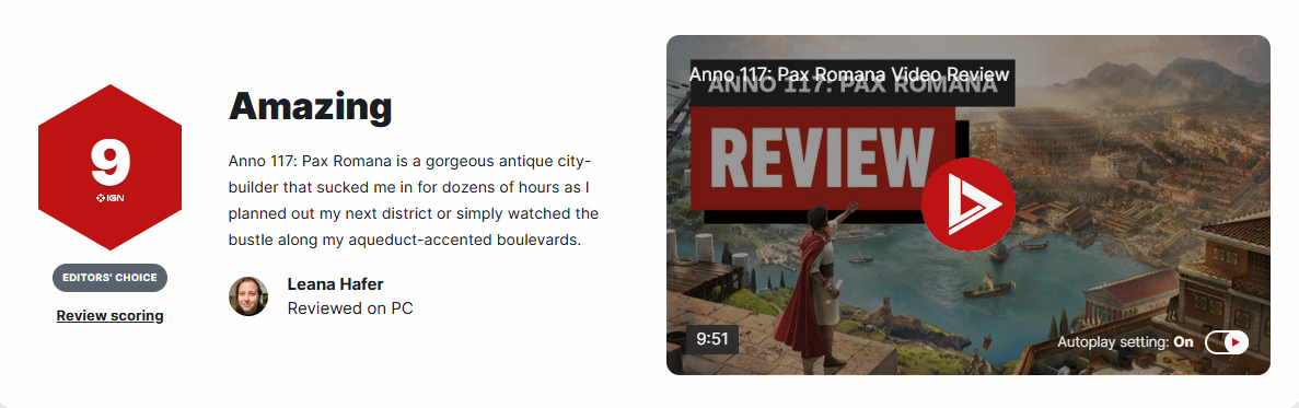 IGN发布育碧策略模拟新游《纪元117:罗马和平》评测,给出9分高分好评。评测编辑直言,这款古典城市建造游戏让自己沉浸十几个小时——从规划下一个建设区域,到凝视高架水渠旁林荫大道上的熙攘人群,每一个细节都充满吸引力。
