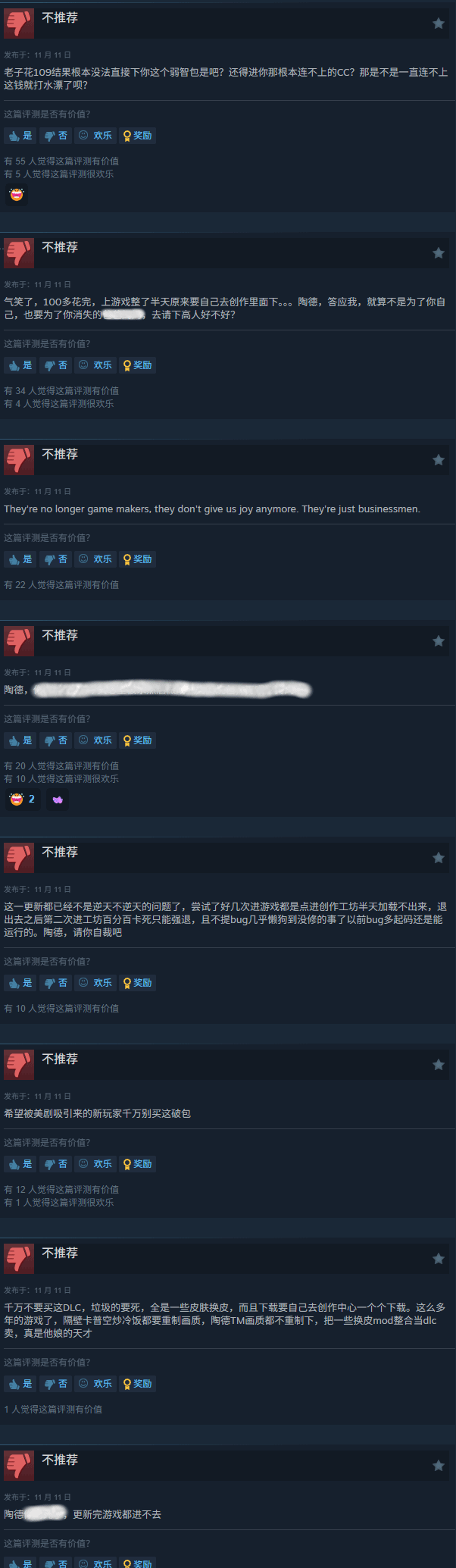 争议焦点集中在同步上线的付费内容上:标准版玩家需花209元购买周年升级包,年度版玩家则需109元购入创意同捆包,而这两个付费选项的差评率高达78%。玩家尖锐指出,所谓的新增内容不过是“换皮MOD当DLC卖”,且需要手动一个个下载,这种“炒冷饭”的做法极其敷衍,完全缺乏十周年纪念应有的诚意。