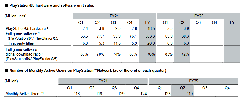 销量背后是PlayStation生态的持续扩张。截至FY25 Q2末,PlayStation Network月活跃用户数达1.19亿,构筑起庞大的玩家基础;全游戏软件数字下载比例高达72%,巩固了数字发行的主导地位,该季度全游戏软件销量8030万套,其中第一方游戏贡献630万套,展现出平台内容消费的旺盛需求。