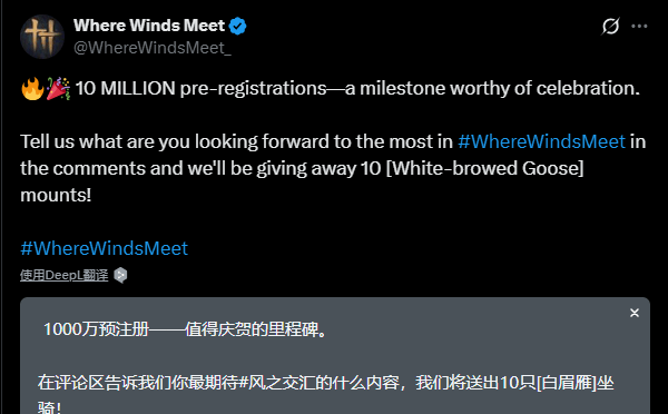 网易旗下武侠开放世界RPG《燕云十六声》再传捷报:预注册人数已突破1000万,超高人气印证了玩家对这款大作的期待。为庆祝这一里程碑,官方将在推特举办抽奖活动,玩家评论分享期待内容即有机会赢取坐骑奖励。