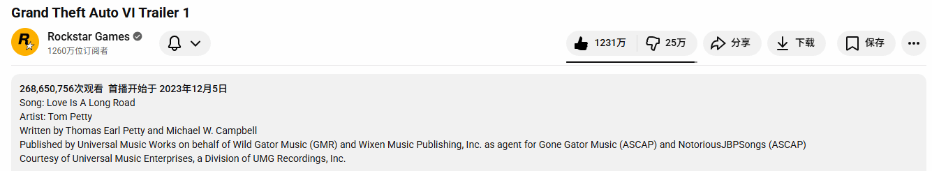 在此之前,《复仇者联盟3》电影预告自2017年发布后,长期保持着“影史单个YouTube账号观看量最高预告片”的纪录,目前播放量为2.68亿。而《GTA6》首支预告于昨日达成2.68亿播放量,成功超越这一数值,目前正朝着2.7亿次播放量冲刺。