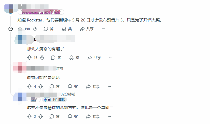 玩笑之余,玩家们对第三支预告的发布时间仍充满猜测。不少人结合R星过往操作推测,官方可能会在《GTA6》原定发售日(5月26日)当天公布新预告,毕竟《侠盗猎车手5》(玩家俗称“三男一狗”)和《荒野大镖客2》都有过类似的“纪念日发预告”传统。