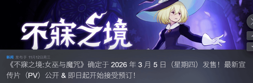 凭借《幻兽帕鲁》爆火的工作室,其此前公布的新作《不寐之境:女巫与魔咒》近日正式官宣发售日期——游戏将于2026年3月5日上线,预购也即将开启。这款融合Roguelike与类银河恶魔城元素的横版游戏,自曝光以来便备受玩家关注。