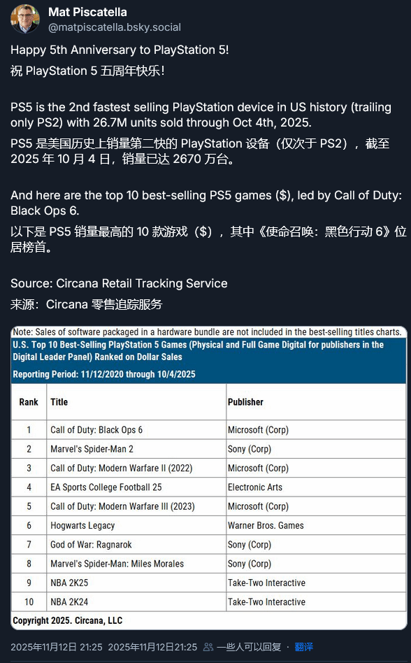 今日,PlayStation 5迎来上市五周年纪念。市场调研机构Circana的分析师Mat Piscatella适时公布了PS5在美国地区的十大畅销游戏榜单,这份榜单不仅展现了过去五年PS5平台的游戏热度分布,更凸显出第三方作品在该平台的强劲市场号召力。