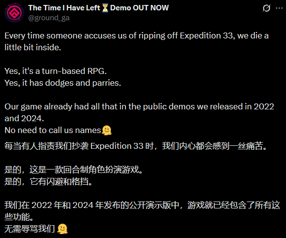 由Ground开发并发行的逃脱冒险回合制RPG《我所剩无几的时间》,近日陷入抄袭争议。有玩家指出该作与今年大热的《光与影:33号远征队》在回合制RPG玩法及闪避格挡机制上存在相似性,对此游戏官方通过推特发文回应,否认抄袭指控并给出关键时间线证据。