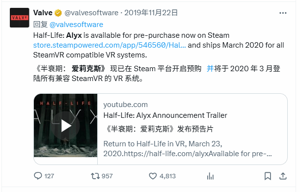 更具说服力的是系列作品的公布规律,《半条命:Alyx》便首次公布于2019年11月22日,正处于这一"传统窗口期"内。这种时间上的巧合,让玩家对《半条命3》在11月18日左右亮相的预测更添信心。作为游戏史上最受期待的作品之一,《半条命3》的消息始终牵动着全球玩家的心,此次多方面线索的叠加,让粉丝们对"圆梦时刻"的到来充满憧憬。
