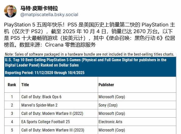 数据统计网站Circana分析师Matt Piscatella近日发文披露,截至2025年10月4日,PS5在美国市场的销量已达2670万台,成功跻身美国历史上销量第二快的PlayStation主机行列。这一成绩的取得,是在疫情、价格上升等多重挑战下实现的,充分展现了PS5的市场号召力。