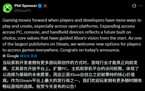斯宾塞在祝贺中表示:“当玩家和开发者拥有更多方式去游玩和创造时,尤其是在开放平台上,游戏业就会向前发展。”他肯定了Valve扩展PC、主机和掌机设备的选择,认为这与Xbox从一开始秉持的“选择”核心价值观相符,展现出行业头部企业间的良性互动姿态。