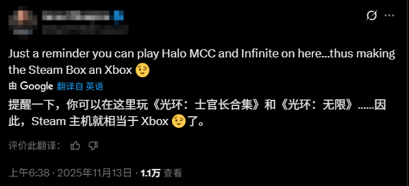 与官方的友好表态不同,玩家评论区呈现出更具话题性的声音。有玩家调侃道:“提醒一下,你可以在这里玩《光环:士官长合集》和《光环:无限》……因此,这款新Steam主机已经相当于是Xbox了!”更有不少网友直接将Steam Machine称为“Xbox杀手”,对其市场潜力充满期待。