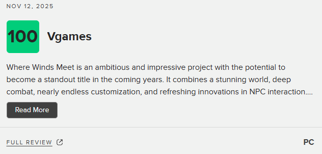 在给出好评的媒体中,Vgames直接打出100分的满分评价,称其为“兼具雄心与实力的杰作”,认为游戏有望在未来几年成为开放世界RPG领域的标杆。评测中提到,《燕云十六声》通过惊艳的武侠世界、深邃的战斗系统、近乎无限的角色定制以及突破性的NPC互动机制,重新定义了角色扮演的边界。尽管需要投入大量时间与耐心探索,但玩家能收获无与伦比的沉浸体验,化身中国古代传奇侠士。在同质化严重的RPG领域,本作证明“真正的角色扮演精髓在于自由塑造世界,MMO要素应是功能而非类型”。