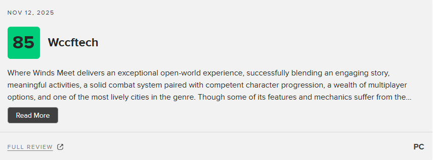 Wccftech则给出85分的评价,肯定其“卓越的开放世界体验”。评测指出,游戏成功融合了引人入胜的剧情、富有深度的玩法、扎实的战斗系统与合理的角色成长体系,辅以丰富的多人模式及同类作品中最具生机的城市景观。虽然部分功能受免费模式制约存在瑕疵,但瑕不掩瑜,甚至能吸引通常不涉猎开放世界游戏的玩家,首发阶段即可提供数百小时的沉浸内容。
