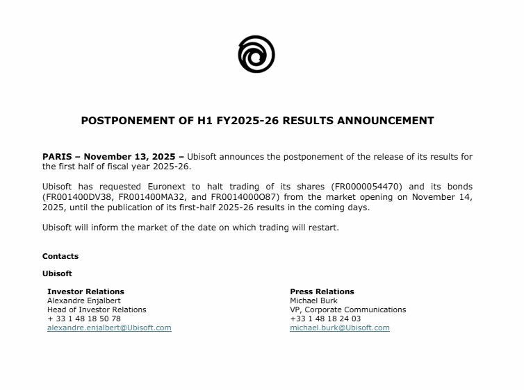育碧突然宣布推迟原定于当日1点30分举行的上半年财报电话会议,并同步向泛欧交易所申请暂停其股票及债券交易。这一临时决策距离财报发布仅差几分钟,引发市场对其经营状况的高度关注。