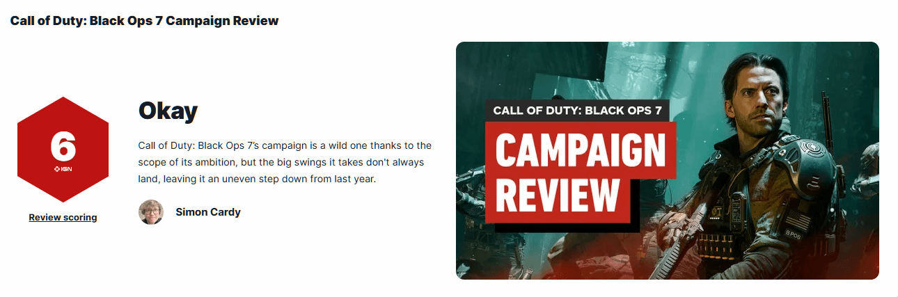 《使命召唤22:黑色行动7》正式发售,其战役模式媒体评分同步解禁。IGN为该模式给出6分评价,认为作品虽怀揣宏大野心进行了不少大胆尝试,但并非所有突破都能成功落地,整体表现相比前作有所退步,呈现出“不好不差、只能说还行”的中规中矩态势。