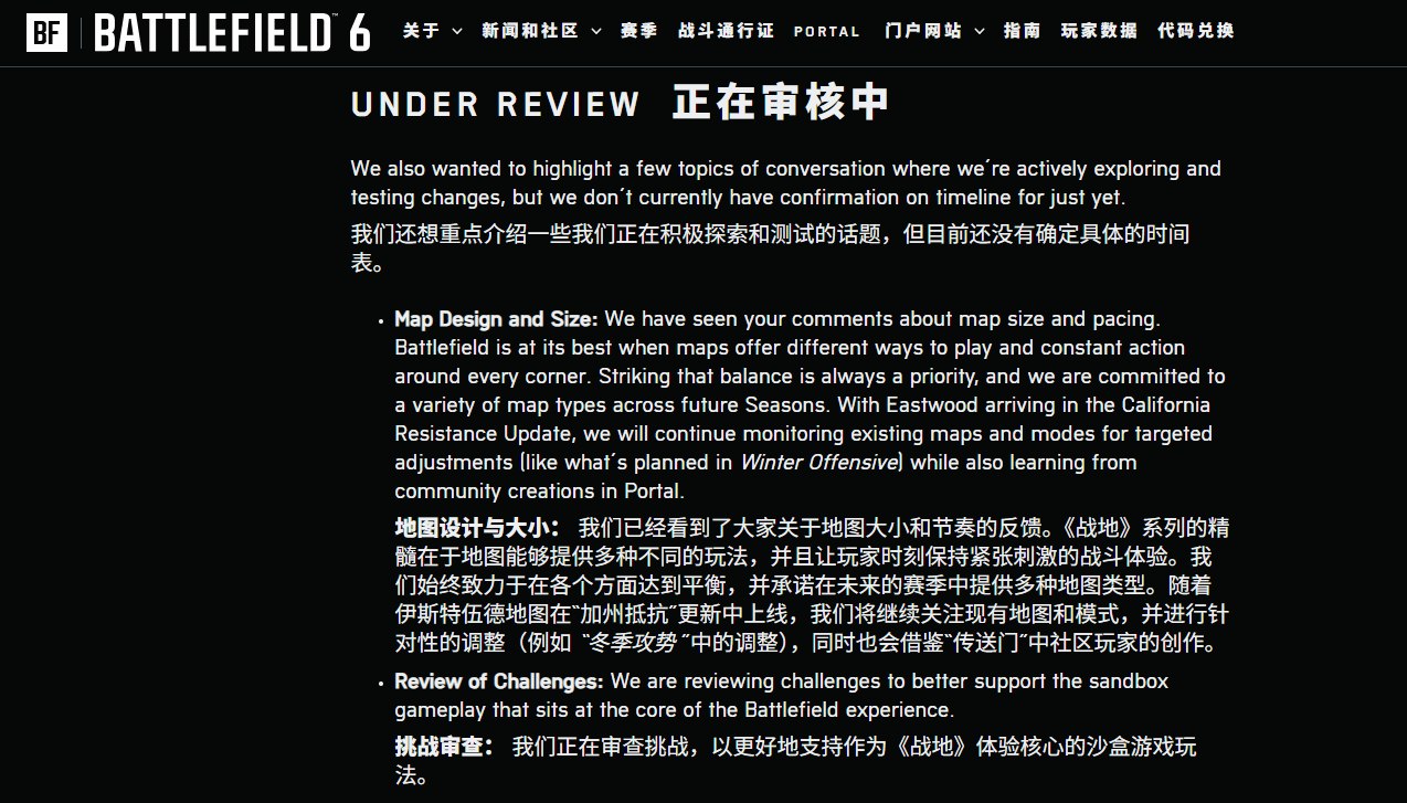 在公告的“审核中”一栏,官方直接提及玩家反馈:“看到了大家对地图大小和节奏的反馈”,直指核心争议点。对于具体的优化方向,官方透露将在即将到来的“加州抵抗”内容中推出新地图,同时会“持续关注现有的地图和模式”,不断进行调整完善。此外,官方还表示将从门户模式中汲取创作灵感,为地图设计注入更多元化的思路,以满足不同玩家对战场体验的需求。