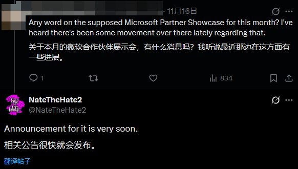 事实上,早在上个月就有消息透露Xbox正在筹备一场新的发布会,但当时具体细节并未公开。直到近日,知名消息人士NateTheHate2在回应粉丝提问时,才进一步确认了这一动态,表示“相关公告很快就会公布”,不过对于发布会的具体时间、内容等关键信息,他并未给出更多透露。