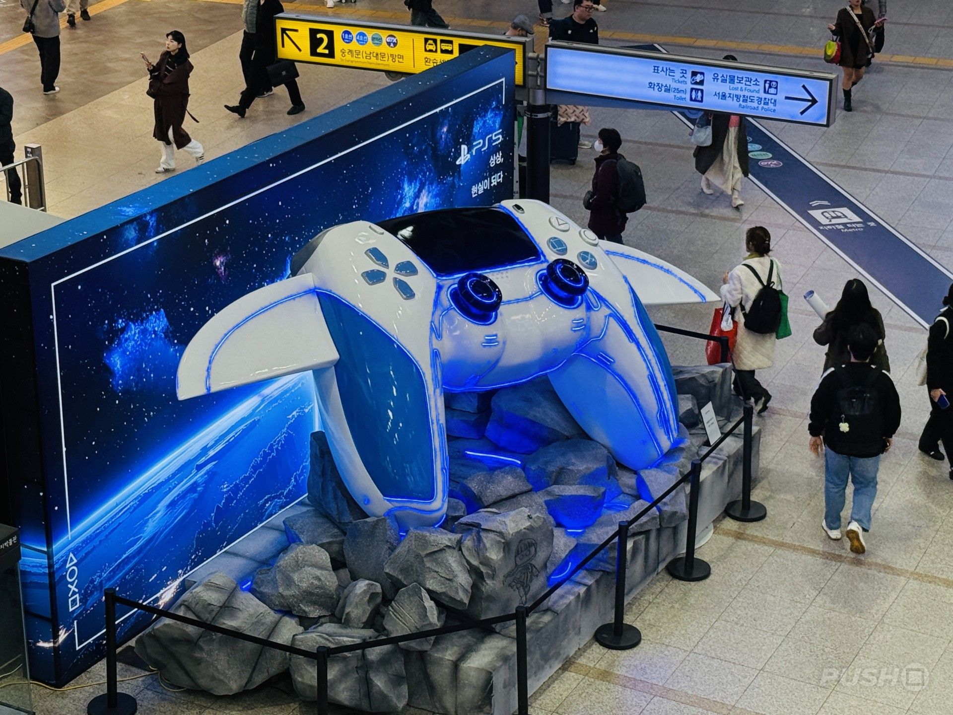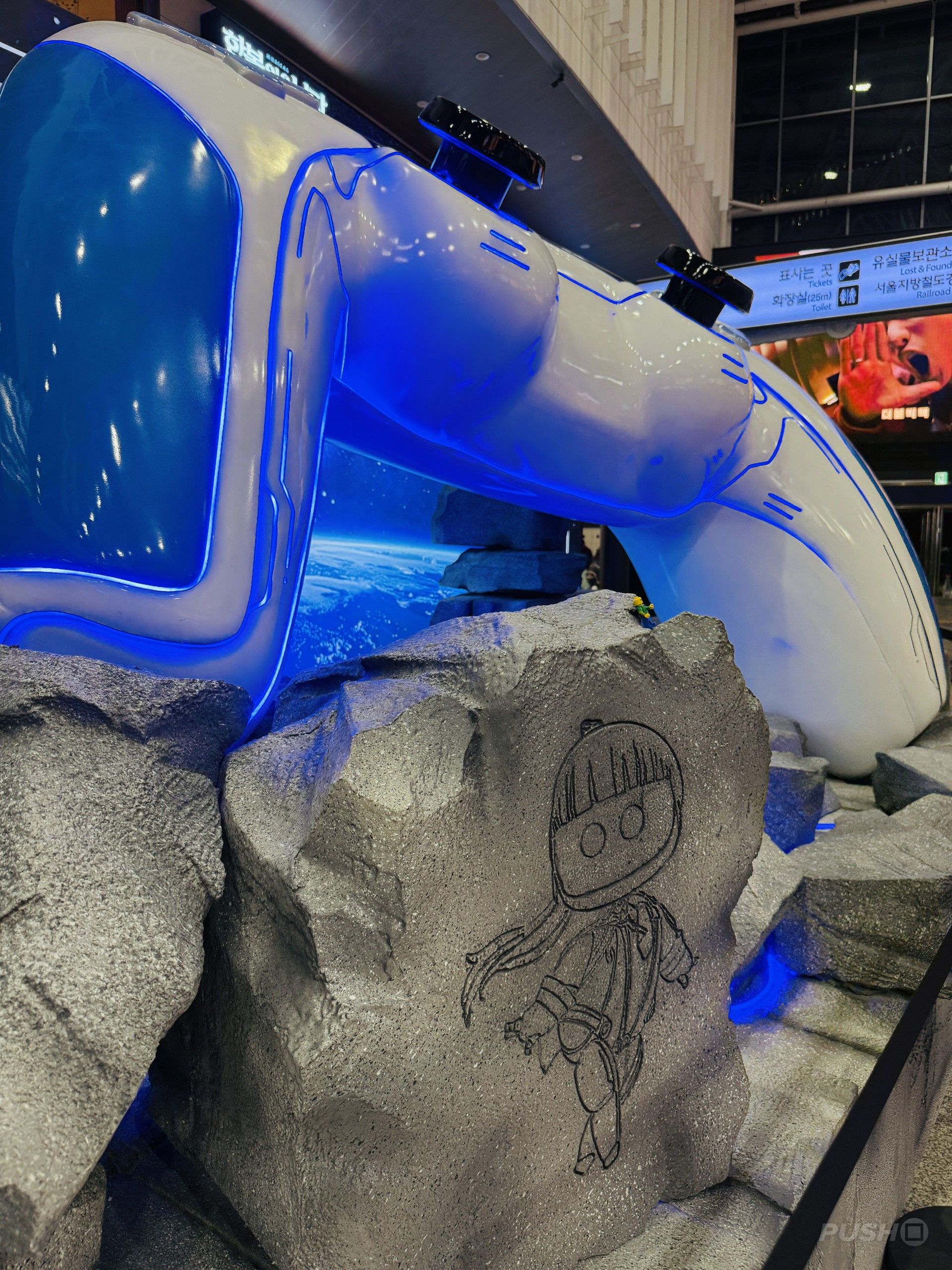 在韩国首尔,创意展区选址于主厅与足球场式环形LED屏之间,整体设计简约却暗藏巧思。展区内,岩层地貌场景中悬浮着宇宙机器人标志性的DualSense手柄造型飞船,发光装置点亮周边区域,成为吸引路人目光的焦点。更有趣的是,手柄飞船下方的岩体还藏有彩蛋——《剑星》女主角伊芙的小机器人形象,为粉丝带来意外惊喜。
