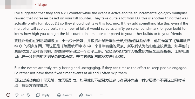 在《暗黑破坏神4》的地牢与开放世界中,随机事件会为玩家设定一分钟左右的倒计时,需在时限内完成特殊要求以获取额外奖励。这一设计对新玩家或许具有吸引力,但对追求效率的老玩家而言却成了“绊脚石”。Reddit玩家Hawke023发帖直言,多数玩家能快速完成任务要求,却仍需等待倒计时结束,这种设定“完全破坏了游戏节奏”,且最终奖励往往“乏善可陈”。