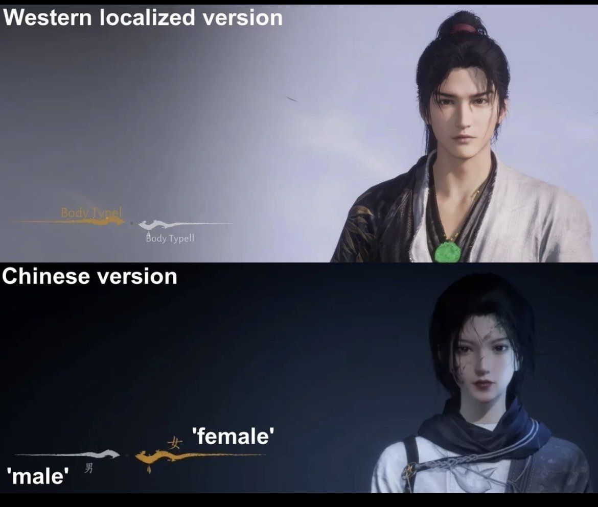 游戏博主Pirat_Nation公开吐槽称,国服版本中角色性别明确分为“男”“女”两类,而国际服却将其替换为“身体类型Ⅰ”和“身体类型Ⅱ”的表述。他认为,这种调整是西方本地化人员对这款中国武侠游戏的不当改动,破坏了原本的设定风格。