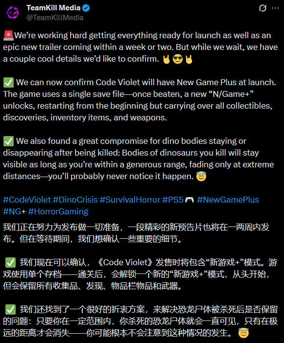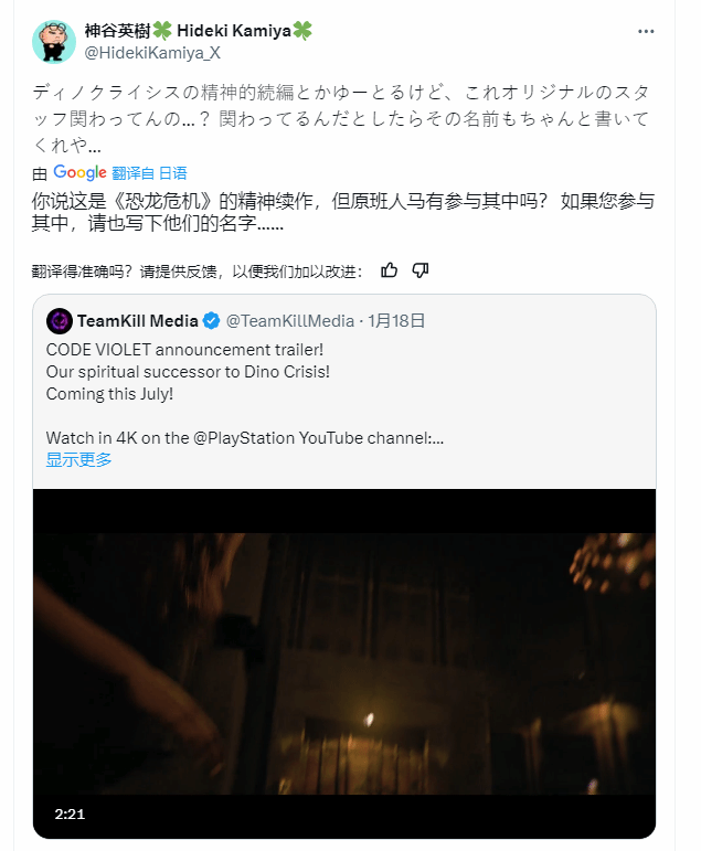 平台方面,开发商TeamKill Media曾多次强调,《Code Violet》为PS5独占作品,不会登陆Steam或其他游戏平台。此外,本作在今年年初因自称“《恐龙危机》精神续作”引发过争议,知名游戏制作人神谷英树当时公开质疑“有原班人马参与其中吗?”,这一话题也让游戏在公布初期就获得了较高的话题度。