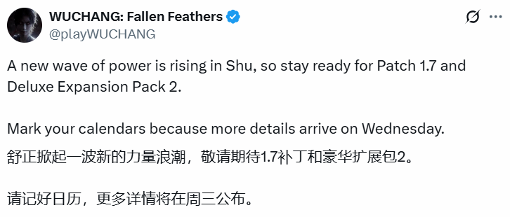 国产动作游戏《明末:渊虚之羽》发布重磅更新预告,一句“一股新的力量正在‘蜀地’崛起,请各位做好准备,迎接1.7版本补丁和豪华扩展包2”,瞬间点燃玩家社区热情,引发关于更新内容的热烈讨论。