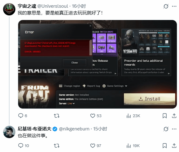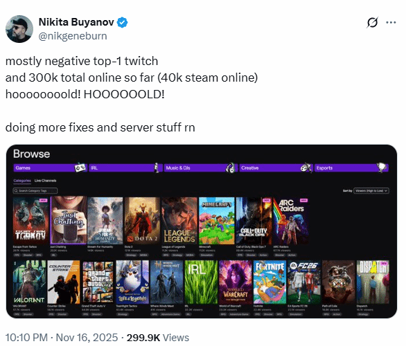 《逃离塔科夫》游戏总监尼基塔·布亚诺夫于11月16日在个人推特上发布了一条引发热议的动态:“我们《逃离塔科夫》成Twitch第一游戏了!(虽然都在骂)”