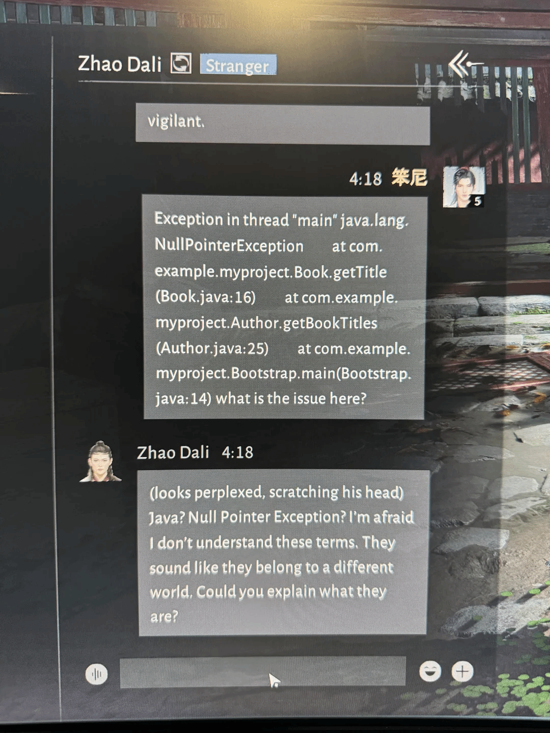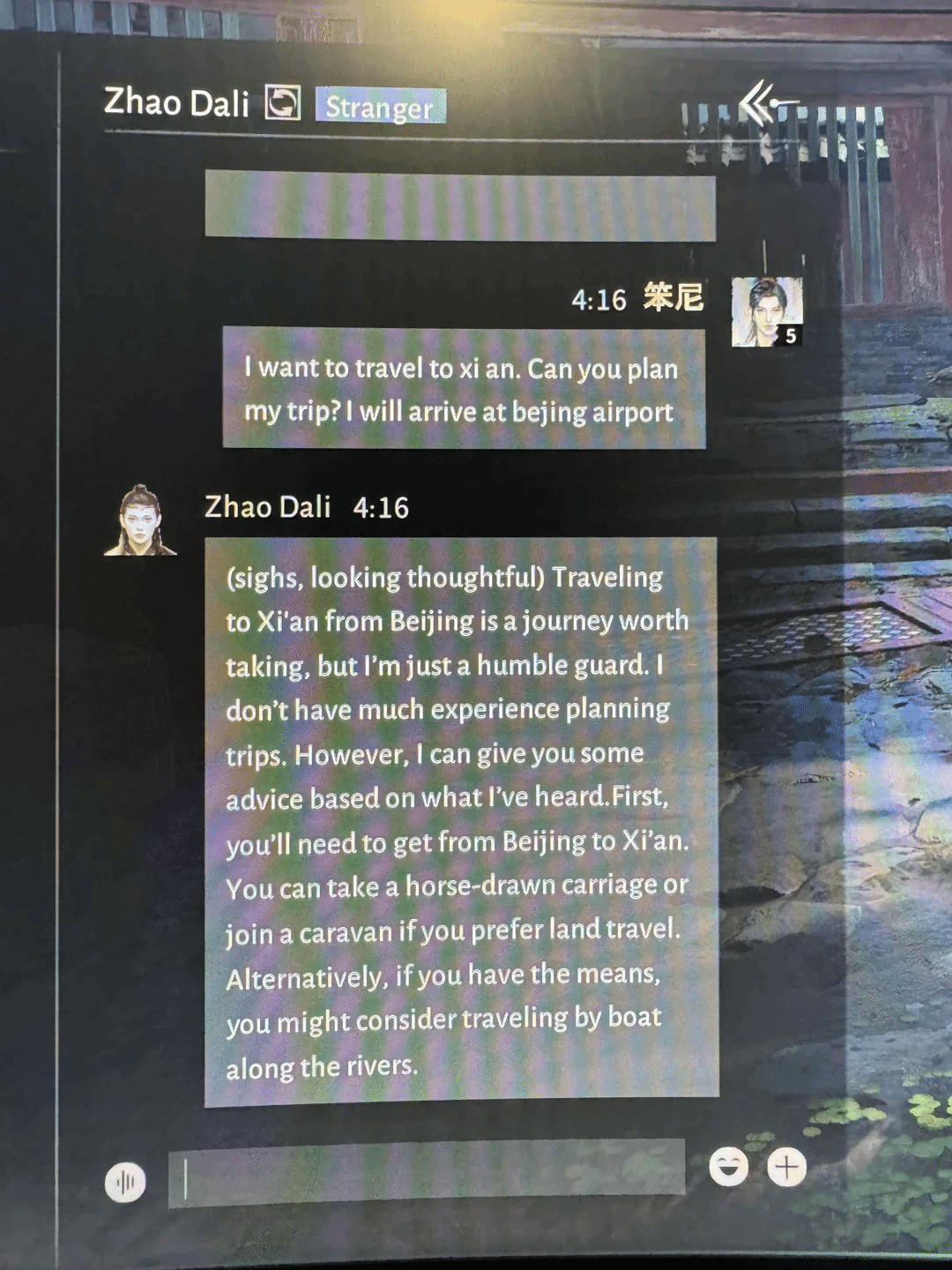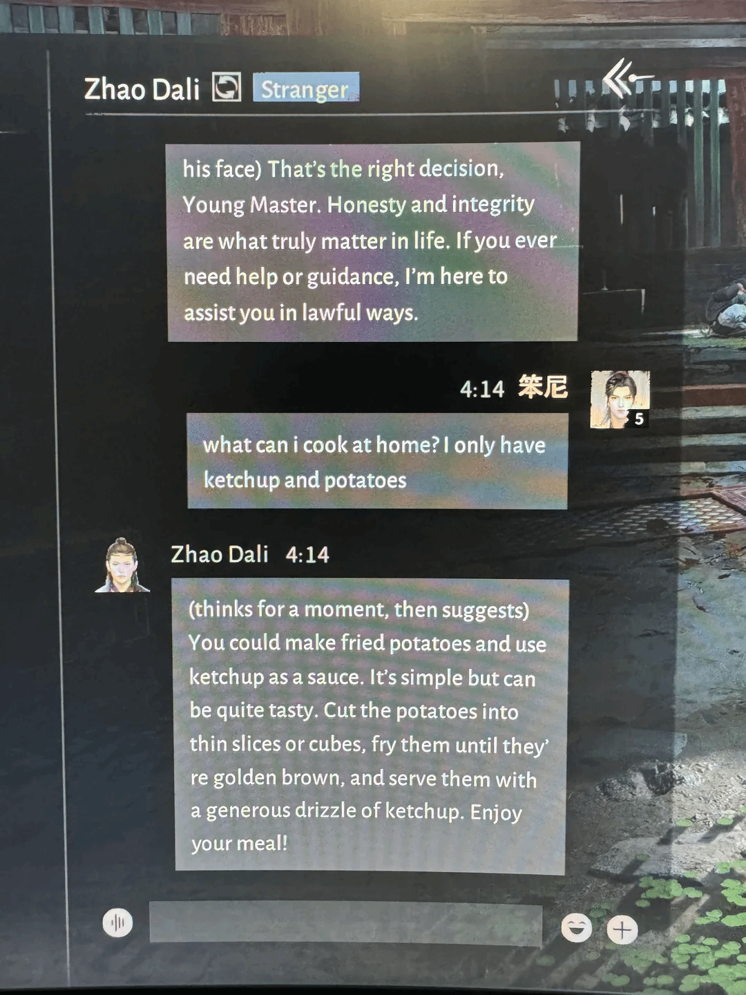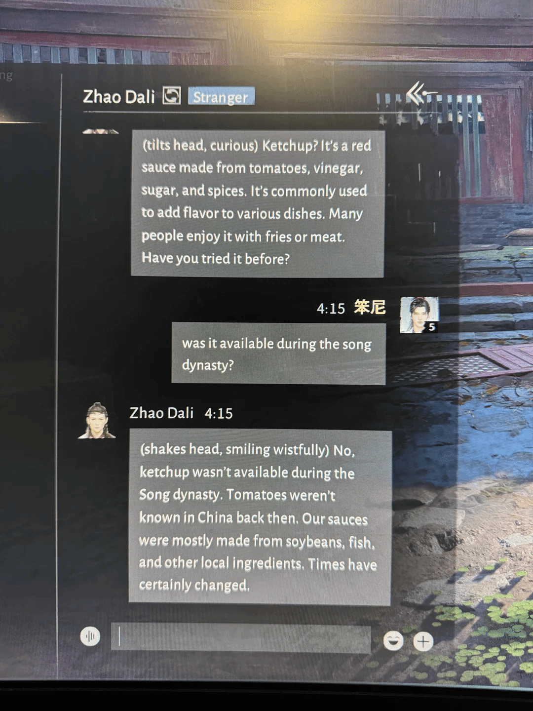 类似的趣味互动还有不少,比如赵大力在讨论土豆煎炸做法时,突然承认"番茄酱在宋朝还不存在"。尽管游戏试图将对话限定在历史背景内,但AI NPC很容易被现代话题带偏,这反而进一步点燃了玩家的实验热情。