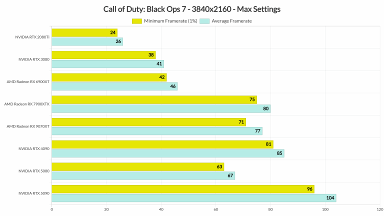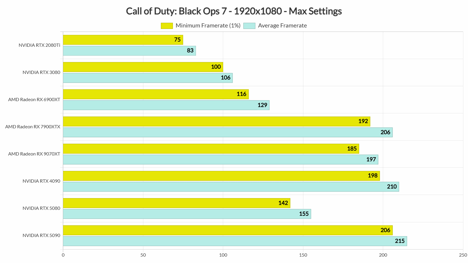 性能测试结果显示,游戏在硬件适配方面表现尚可:1080P分辨率最高画质下,所有测试显卡帧率均超60FPS,即便RTX 2080Ti也能稳定在75FPS以上;1440P最高画质时,多数显卡能保障流畅体验,仅RTX 2080Ti帧率跌破60FPS;原生4K最高画质下,性能前五的显卡均实现60FPS以上帧率。值得注意的是,游戏对AMD硬件优化尤为出色——Radeon RX 9070XT运行速度超越RTX 5080,性能接近RTX 4090,Radeon RX 6900XT也显著快于RTX 3080,不过RTX 4090仍在4K分辨率下保持性能优势。
