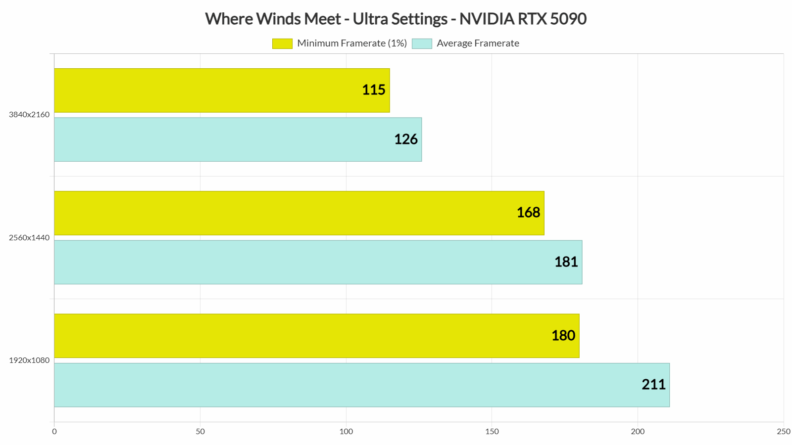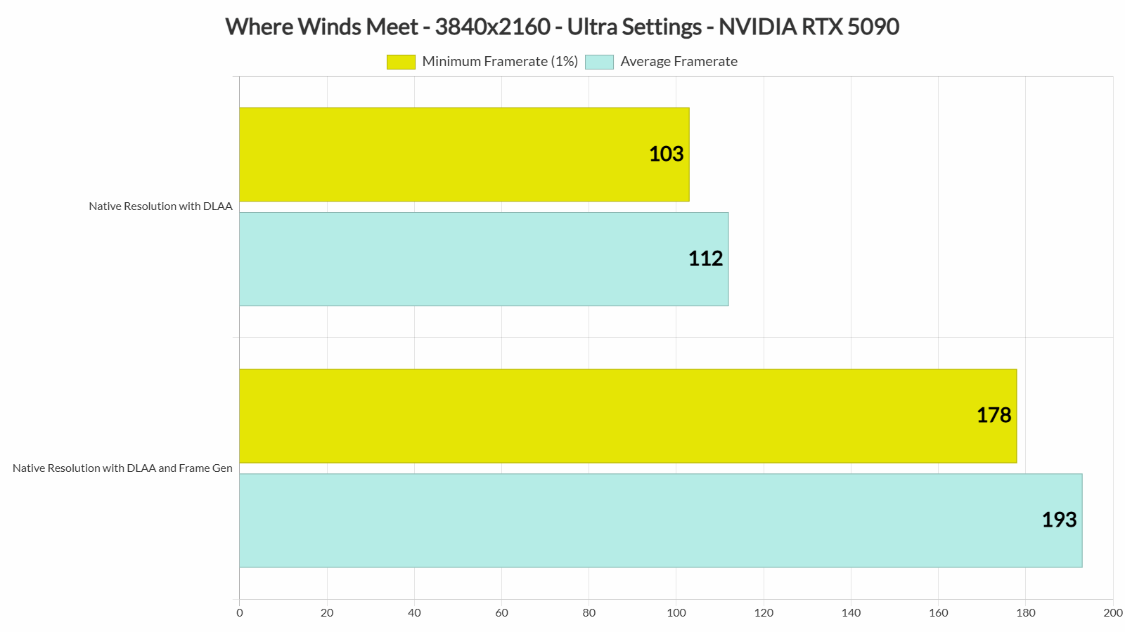 性能表现上,《燕云十六声》展现出出色的优化水平:原生4K/最高画质设置下,RTX 5090可实现最低115FPS、平均126FPS的帧率;开启帧生成后,全程帧率稳定在175FPS以上,配合超100FPS的基准帧率,操作响应极为流畅。在1440P/最高画质下,帧率始终高于165FPS;1080P/最高画质则达到最低180FPS、平均211FPS。
