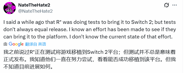 NateTheHate2近日通过个人社交账号披露了关键信息:“早在之前我就提到过,R星一直在进行测试,探索将《GTA6》带到NS2平台的可行性。但必须明确的是,测试并不等同于最终会实现发行。我能确认的是,团队确实在为此付出努力,持续评估平台适配的可能性。”尽管他表示暂不了解移植工作的“最新进展细节”,但这番表态直接印证了R星针对NS2平台的适配动作并非空穴来风。