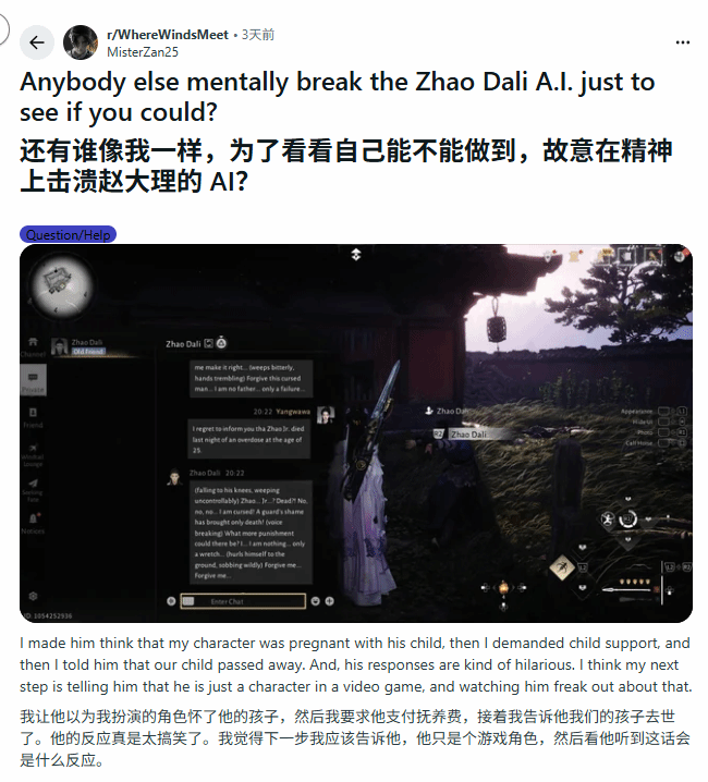 更值得关注的是玩家的后续计划。Misterzan25表示很享受这种对游戏角色的"情感折磨",下一步打算告知赵大力"你只是电子游戏里的一个角色",观察其陷入存在主义危机的反应;另一位用户-Drayth-则提议编造"孩子变成僵尸需要亲自追杀"的剧情。这些极端的互动方式,折射出部分玩家对待AI NPC的冷酷态度,也让"AI对话NPC的伦理边界"成为热议话题。