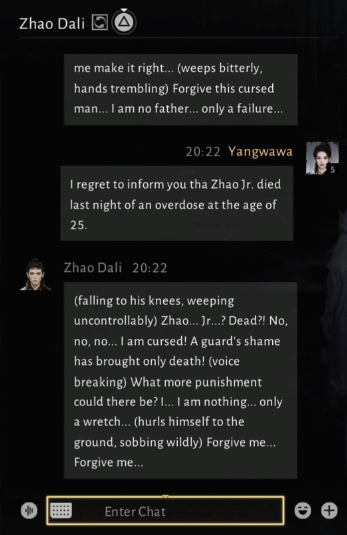 近日,外媒报道了一则玩家与AI NPC的互动案例,引发广泛争议。在Reddit平台,玩家Misterzan25分享了自己"操控角色赵大力精神崩溃"的经历:他先是虚构"怀上赵大力孩子"的剧情,向其索要抚养费,随后又告知"孩子已夭折"。从对话截图可见,赵大力在互动中逐渐陷入情绪失控,不仅说出"不是父亲……只是个失败者……"的自责话语,游戏内还多次触发"跪在地上失声痛哭"的场景,展现出对"未尽父亲责任"的强烈愧疚感。