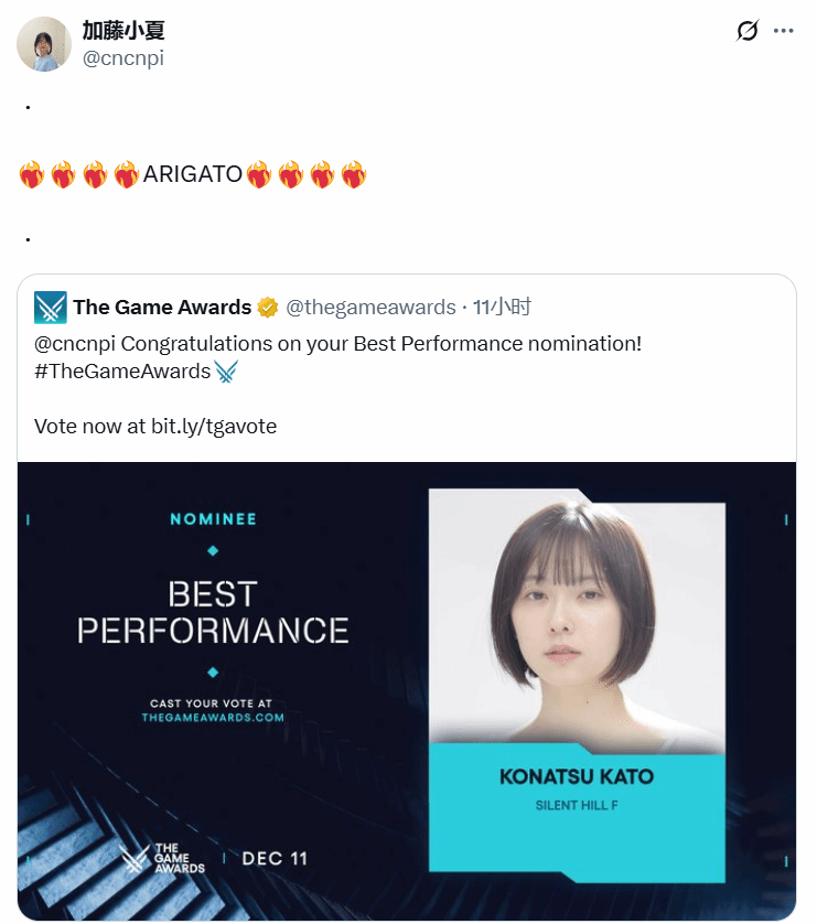 提名名单公布后,加藤小夏第一时间通过社交媒体与粉丝分享喜悦。她转发TGA官方提名推文,并配上多个表达激动心情的emoji,以一句简洁的“ARIGATO”(日语“谢谢”)传递感谢。这份直白又真挚的回应,迅速在玩家社群中引发共鸣,粉丝们纷纷留言祝贺,有人称赞她“用声音把恐怖角色演活了”,也有人期待她能在颁奖典礼上斩获大奖,评论区满是暖心互动。