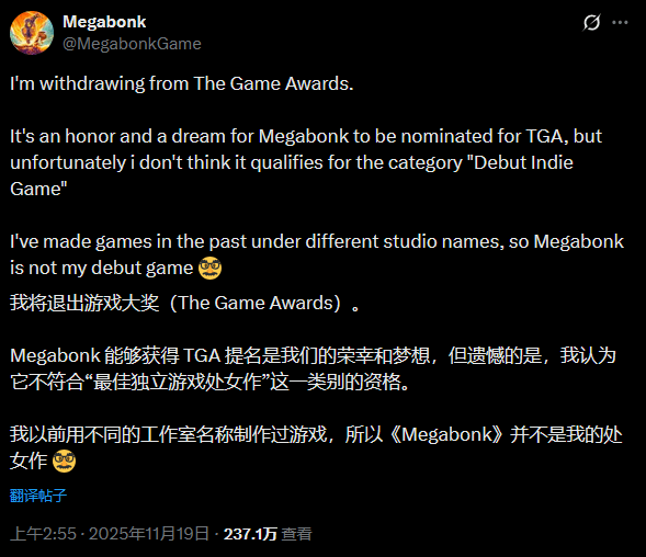 开发者在声明中呼吁"把票投给其他优秀处女作",主动让贤的举动既展现个人品格,更凸显对奖项公平性的珍视,为行业树立了诚信标杆。